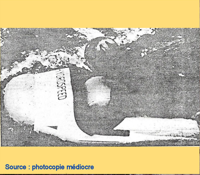 Nous avons Présenté. en début de semaine, l'hydrospeed ou luge d'eau avec ses détails de construction et sa maniabilité, son faible encombrement et son poids inférieur à 15 kg. Des essais ou plutôt un essai de démonstration en Saône, par les hommes-grenouilles du centre de sécurité, étaient tout simplement destinés à montrer la position de son occupant obligé de le propulser en nageant. ... SUITE
